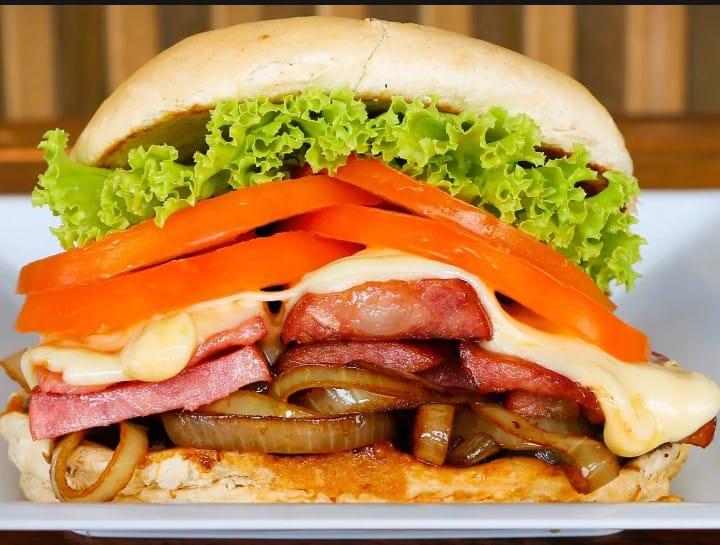 PÃO ARGOLA, HAMBÚRGUER ARTESANAL 140 GRAMAS, CALABRESA, CEBOLA GRELHADO, PRESUNTO, MUSSARELA, TOMATE, ALFACE, MILHO e MAIONESE FAMILLY´S.